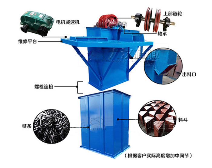 斗式提升機(jī)主要由料斗、牽引件、張緊裝置、加料和卸料裝置、驅(qū)動(dòng)裝置等組成。