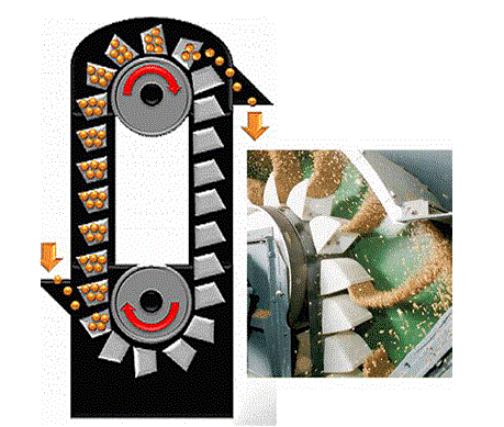 利用離心力將物料甩出卸料口。適用于提升速度快、干燥、小顆粒的場合。料斗的速度比較高,一般為每米1-2秒,要保持這個速度,必須選擇正確的驅(qū)動輪,速度和直徑尤為重要,卸料口的選擇不容忽視。