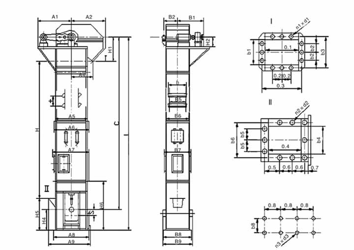 垂直斗式提升機(jī)由頭部驅(qū)動(dòng)組件、中部機(jī)殼、底部張緊結(jié)構(gòu)、料斗與牽引構(gòu)件組成,各部件配合決定可實(shí)現(xiàn)的提升高度。牽引構(gòu)件包含橡膠膠帶、圓環(huán)鏈與板式鏈。鏈條類構(gòu)件承載能力更強(qiáng),板鏈適配重載與高磨損場(chǎng)景,高度延伸時(shí)仍能保持傳動(dòng)穩(wěn)定。中部機(jī)殼由多節(jié)標(biāo)準(zhǔn)段拼接,底部張緊裝置可自動(dòng)補(bǔ)償牽引件伸長(zhǎng)量,保障運(yùn)行時(shí)料斗位置不偏移。下面是結(jié)構(gòu)示意圖。