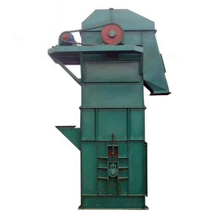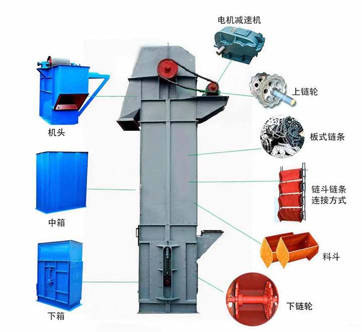 TD400型斗式提升機由三個大的部分組成,分別是機頭、中箱和下箱。機頭上面配有電機減速機和上鏈輪。機箱里面有板式鏈條、料斗和下鏈輪。通過電機的轉(zhuǎn)動帶動鏈條然后完成從下到上的輸送物料。